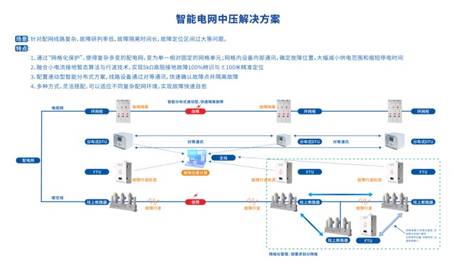 面对中压配电网结构复杂、故障处置效率低的难题,我公司全新推出的一体化智能自愈方案。系统采用“智能分区自治”理念,将复杂线路划分为多个协同运行的智能单元,依托智能算法与高效通信,实现秒级故障定位、隔离和无感恢复供电,大幅提升供电可靠性。